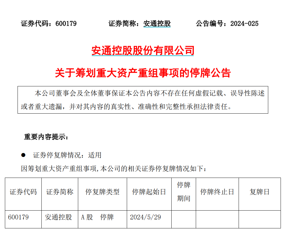根据公告,本次交易预计构成《上市公司重大资产重组管理办法(2023年修订)》规定的重大资产重组,构成重组上市,同时亦构成关联交易。安通控股股票自5月29日(星期三)开市起停牌,预计停牌时间不超过10个交易日。